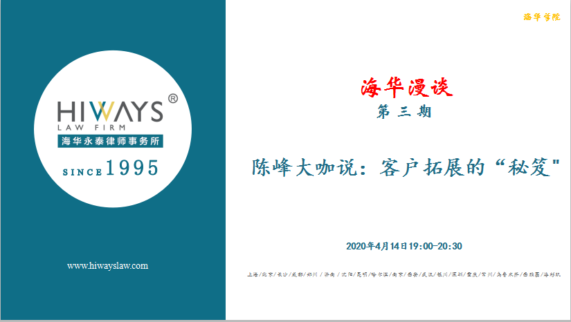2020年4月14日19:00, 第三期海华漫谈——陈峰大咖说:客户拓展的“秘笈”准时上线。在近2个小时的分享和热烈讨论中,海华永泰律师事务所执行主任陈峰律师与全国各地的同仁一起分享自己的客户管理经验和感悟。